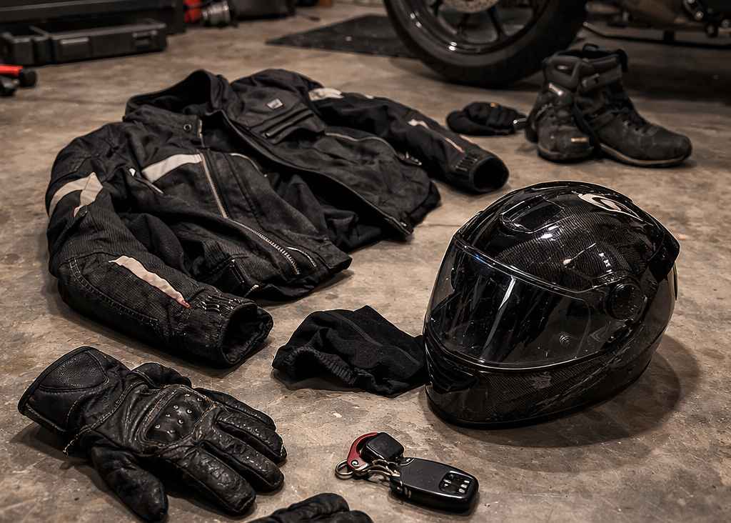 Your helmet ends up on a chair.Your jacket gets tossed over something.Your gloves disappear somewhere in the garage.